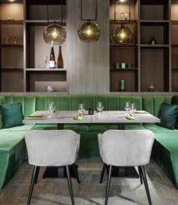 Tlumené přírodní tóny a přilehlá velká terasa přenesou veškerou vaši pozornost právě k tomuto okamžiku. Jste tady a teď a ochutnáváte to nejlepší, co vám hory mohou nabídnout. Ke každému chodu vám rádi doporučíme to nejlepší víno. Pokud byste chtěli poradit, jsme tu pro vás.